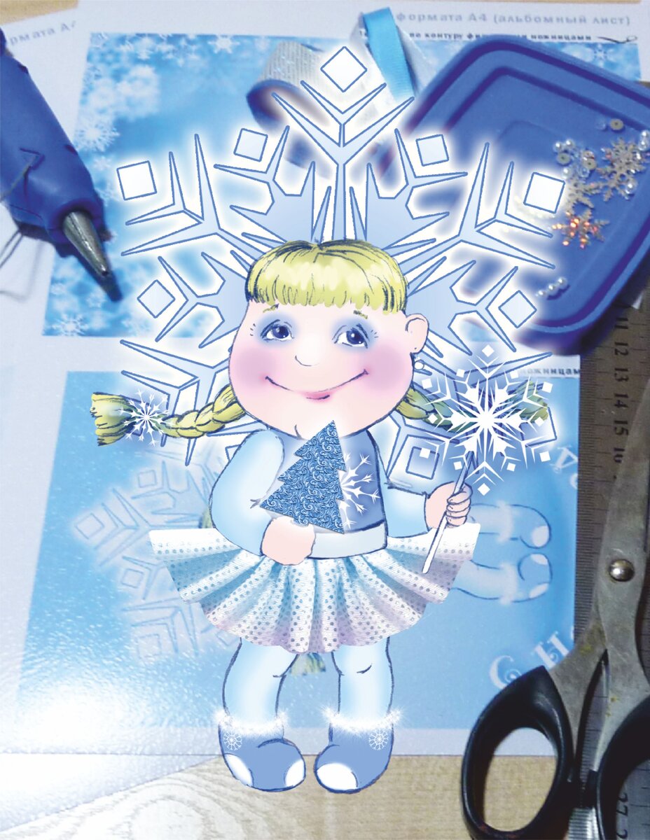 Надежда Шабанова Новый год скоро и это факт, поэтому предлагаю вместе сделать к подаркам для родных и близких открытку с такой вот забавной девочкой-Снежинкой. Кто из девочек не надевал костюм «Снежинки» на Новогоднюю елку? Сколько радости, волнения. Белые пышные платьица… пахнущая хвоей елка и волнующее ожидание подарков. Для работы нам понадобиться: 1. Лист белого картона или плотной белой бумаги обычного формата А4. 2. Распечатка. Я рисую открытки сама, вы можете тоже нарисовать, а можете воспользоваться приложенными страницами для распечатки. Совсем не обязательно искать типографию. Распечатать их можно в любом ближайшем фотосалоне на фотобумаге размером с обычный офисный листик А4. 3. Ножницы нужны с фигурным краем (я использую дешевые китайские «зиг-заг»), обычные ножницы и маленькие, для вырезания мелких деталей. 4. Линейка, простой карандаш, клей, объемный двусторонний скотч. 5. 20 см белой или голубой капроновой ленточки шириной 2-3 см, или такой же кусочек фатина, или даже
