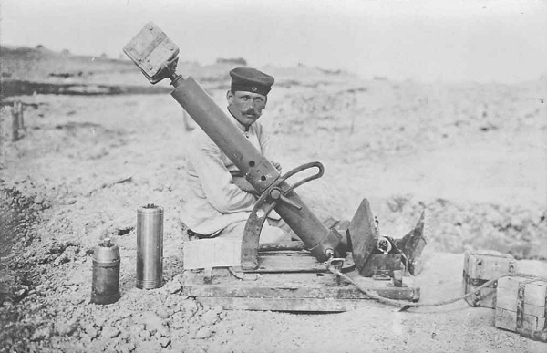 Сконструировал надкалиберную мину со стабилизатором буквально из подручных средств. Стволы морских 47 мм орудий закрепил на колесных лафетах. Когда же их не хватило, приспособил просто металлические трубы на деревянных колодах. Вместо обычных снарядов использовал самодельные шестовые мины, что выпускались под углом от 45 до 85° по навесной траектории, и могли уничтожать закрытые цели, недоступные ружейно-пулеметному и артиллерийскому настильному огню.