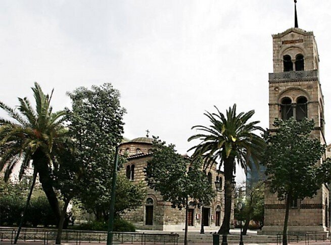 Оказалось, что в античные времена в этом месте проходил водопровод и был подземный источник, а позднее римляне построили там бани. Потом водопровод и бани были разрушены и на их месте построили храм Аполлона. В 11 веке на его месте появилась византийская церковь, которая до 17 века функционировала в составе женского монастыря. Однако во время сильного землетрясения 1702 года она была разрушена. Потом на этом месте был основан уже мужской монастырь, но и он был позднее разрушен, но на этот раз во время осады Акрополя в годы борьбы греков за Независимость. Только в 1850 году на этом месте появилась православная церковь в том виде, в котором ее можно увидеть сегодня. Раньше она была окружена красивой чугунной решеткой, специально отлитой в Санкт-Петербурге, но потом греческие власти почему-то приказали ее убрать. Но ограда не пропала, русские эмигранты сняли и перенесли ее к Русскому дому, что в квартале Аргируполис, о котором мы расскажем позднее.