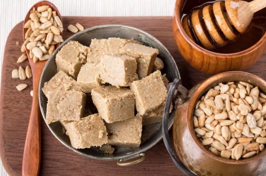 Главный компонент халвы — орехи и семечки. А значит, ее пользу будем рассматривать со стороны пользы именно этих продуктов. Начнем с того, что орехи и семечки богаты белками, соответственно богата белками и халва.
