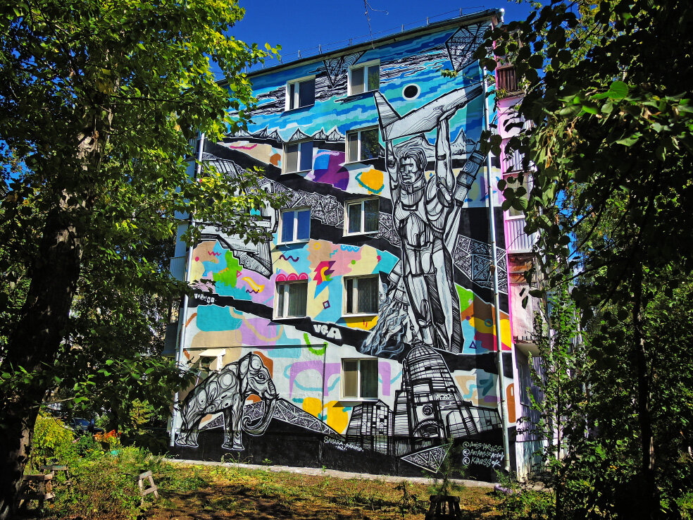 В сентябре 2021 года в Самаре прошёл второй фестиваль уличного искусства Samara Ground. Приурочен он был к празднованию Дня города. В рамках фестиваля были созданы 9 муралов и 3 арт-объекта в Самаре и 5 рисунков в Тольятти. Во второй части обзора покажу мурал, авторами которого стали самарские художники. Проспект Кирова, 260. Авторы - Денис Вертиго, Арт Абстрактов и Клаус. Эта работа стоит особняком во многих смыслах. Во-первых, в прямом. Дом, на котором нарисовано изображение, находится в спальном районе, довольно далеко от исторической части города, где сосредоточена основная часть изображений. Во-вторых, авторов сразу три. А в-третьих, на противоположной стене этого дома уже есть граффити, которое в прошлом году создал Денис Вертиго. Домов с двумя муралами в Самаре всего два, этот - один из них. Почему-то именно этот объект заранее никак не анонсировался. О его существовании я узнал только, когда появился полный список объектов. А произошло это на следующий день после официального о