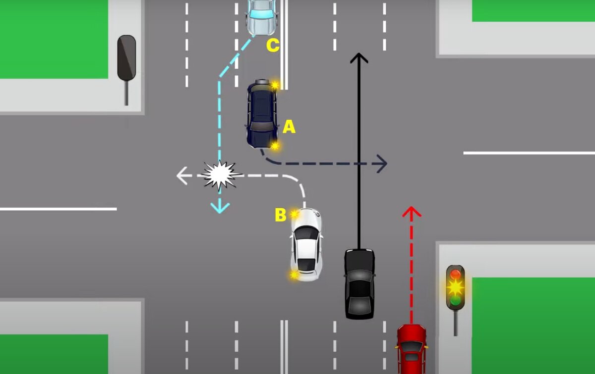 На рисунке мы видим, что из-за автомобиля А, неожиданно на высокой скорости вылетает на перекресток автомобиль С и едет прямо, водитель автомобиля B в данный момент уже начинает манёвр и сталкивается со встречным автомобилем, данные ДТП регулярно происходят, так как автомобиль С может быть не видно, его скорость может быть большой или просто из-за невнимательности. В добавок светофор может быть настроен на разные фазы работы, к примеру для вас горит уже желтый, а для автомобилей которые двигаются во встречном направлении ещё зеленый. Поэтому перед осуществлением маневра, автомобилю B необходимо убедиться, что из-за автомобиля А не вылетит на большой скорости другой автомобиль или мотоциклист, пытающийся успеть проехать перекресток на разрежающий сигнал светофора.