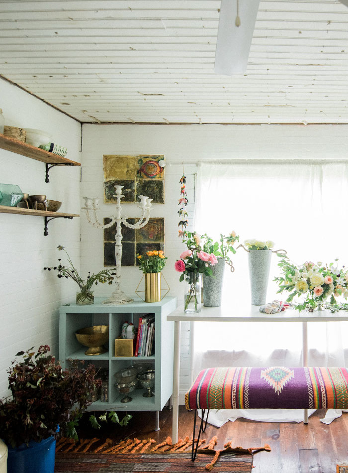 Домашняя цветочная студия Мелиссы и Шона спроектирована так, чтобы быть весёлой и вдохновляющей, но в то же время функциональной. Припасы хранятся на полках, сделанных из амбарного дерева, а в вазах, собранных в благотворительных магазинах, хранятся некоторые из цветочных творений пары.
