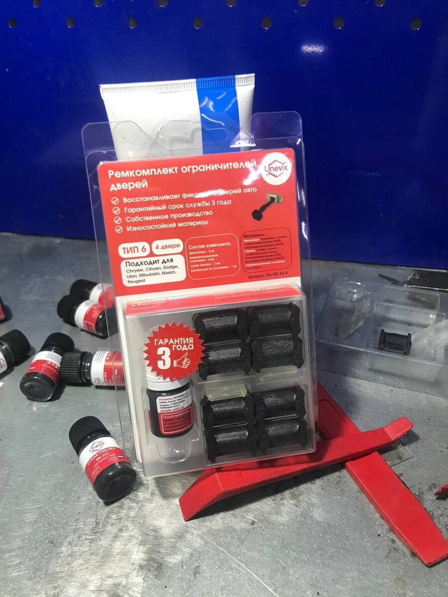 инструкция по установке — 1 шт. УСТАНОВИТЬ МОЖНО САМОСТОЯТЕЛЬНО: 1. Снимите внутреннюю обшивку двери. Выкрутите три болта крепления ограничителя двери и извлеките его из двери. 2. Разогните четыре прижима и снимите крышку. 3. Извлеките фиксаторы вместе с упругими элементами. Вы увидите изношенные пластмассовые фиксаторы. 4. Очистите шток и упругие элементы от грязи, насухо протрите их. Аппликатором нанесите со всех сторон сухую смазку на шток, новые фиксаторы и упругие элементы. Дайте смазке высохнуть несколько минут. Сухая смазка продлит срок службы фиксаторов, сделает ход ограничителя мягче на