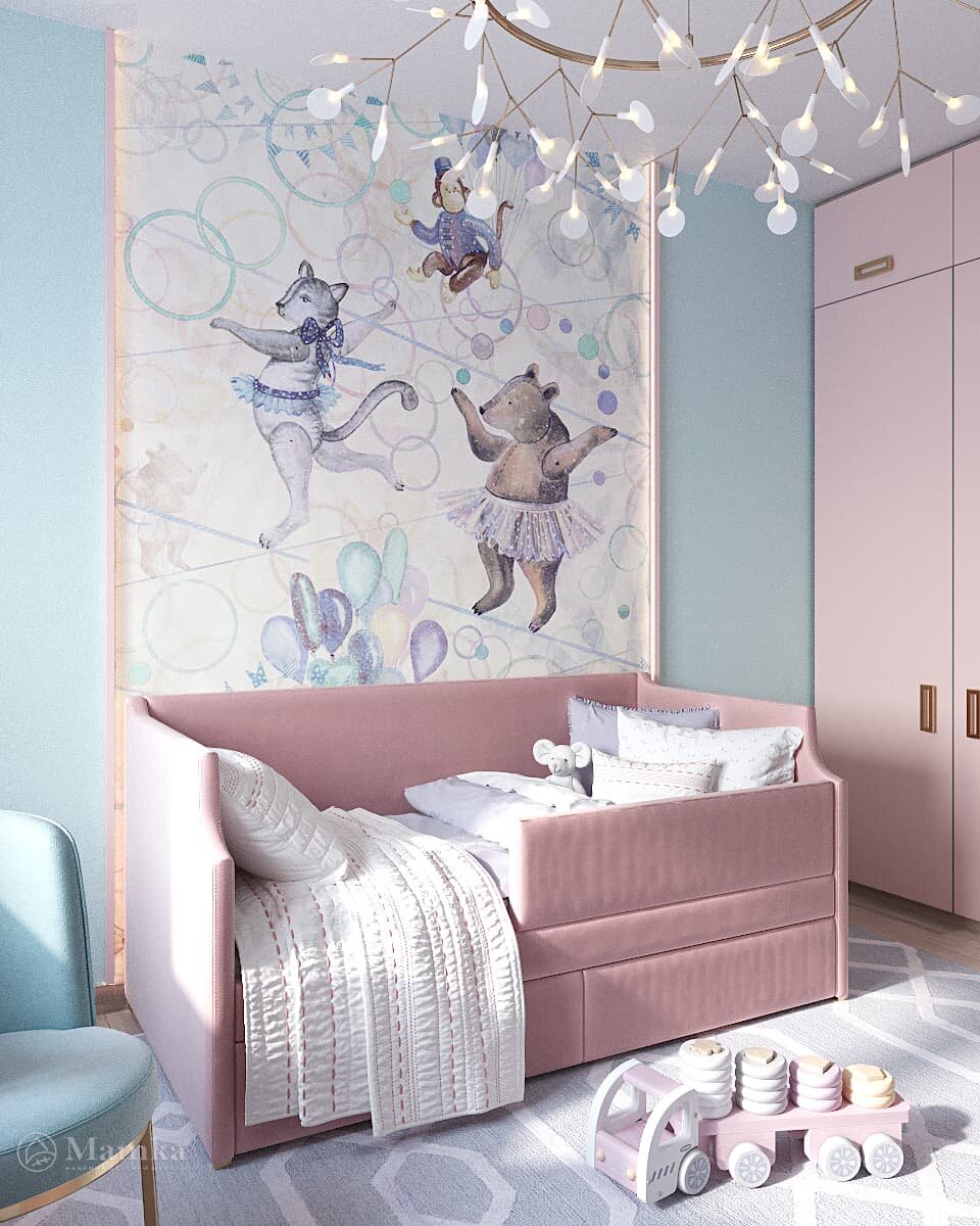 Интересует дизайн комнаты девочки, который бы отражал ее характер и увлечения? Фабрика Mamka поможет вам определиться с выбором. Заходите на сайт и вдохновляйтесь новыми идеями Для небольшой комнаты с насыщенной голубой отделкой дизайнер разработал функциональную и довольно лаконичную мебель. Фабрика мебели Mamka способна воплотить задумку с учетом всем потребностей помещения. Простые формы вовсе не кажутся скучными из-за насыщенного пепельно-розового оттенка. Девочке понравится уютная кровать с мягкими защитными бортиками. Спальное место широкое и комфортное. В нижней части конструкции есть два вместительных выдвижных ящика, которые можно использовать для хранения постельного белья, одежды, игрушек и других вещей. Системы хранения тут вместительные. Шкаф с тремя секциями и большой антресолью с легкостью поместит всю одежду, включая объемные курточки и шубки. Также в комплекте есть большой комод с четырьмя ящиками и оригинальная тумбочка с местом для сиденья. Небольшой мягкий матрас