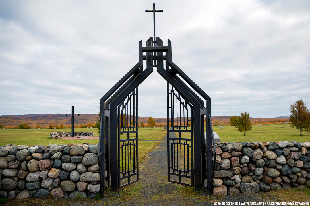 Мы забрались довольно далеко на север, в приграничные районы с Норвегией. Путь мы держали к посёлку Лиинахамари, где хотели посмотреть на фьорды и брошенную немецкую батарею времён Великой Отечественной войны. По дороге заехали в небольшой военный городок – Печенгу. Хотели поснимать с квадрокоптера виды устья реки, которое на Гугл-картах выглядело живописно. Но до устья доехать не смогли – не нашли дорогу. Зато нашли немецкое военное кладбище и остановились посмотреть, т.к. кладбище выглядит очень необычно и уже с дороги было видно, что крест не православный, что сразу бросилось в глаза. На входе простая табличка, выбитая на гранитной глыбе, сообщающая о том, что здесь покоятся солдаты погибшие в период 1941-1944 гг. Проходим и поражаемся ухоженностью и лаконичностью кладбища. И размерами. Вначале мне непонятно, зачем было делать такое большое кладбище, если могил нет, и оно скорее мемориальное. Но немного походив, понимаю, что я ошибся. Эта вся территория и есть одна большая могила.