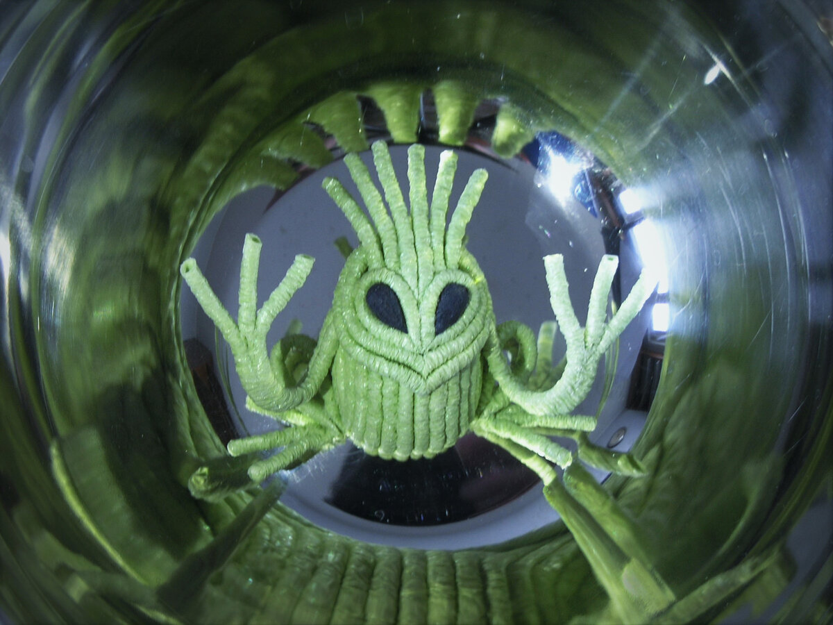 Когда летательный аппарат пришельцев опустился на Землю, первым нас поприветствовал командир корабля. Мы долго беседовали с ним и успели его хорошо рассмотреть. Сейчас мы попробуем сделать его из гофробумаги и салфеток. Нам понадобятся газетный лист размером А4, две салфетки, 15 зелёных гофротрубочек и два квадрата 10х10 см из чёрной гофробумаги. Как скручивать гофротрубочки, можно посмотреть здесь. Из газеты и салфеток сделаем основу - туловище. Как сделать основу можно посмотреть тут. Оклеим основу гофротрубочками. Заканчиваем оклейку одинарными трубочками. Глаза сделаем из чёрных квадратов. Нанесём на бумагу клей и скатаем форму, напоминающую капельку. Каждую капельку оклеим одинарной трубочкой. Подготовим отрезки трубочек, срежем кончики под углом. Приклеим глаза. Приклеим первую трубочку по центру. Приклеим трубочки по бокам. Склеим две трубочки, приложим снизу и завернём назад. Всё зафиксируем клеем. Так он выглядит сбоку. Разрежем трубочки по бороздке. Приклеим ручки, сделаем на