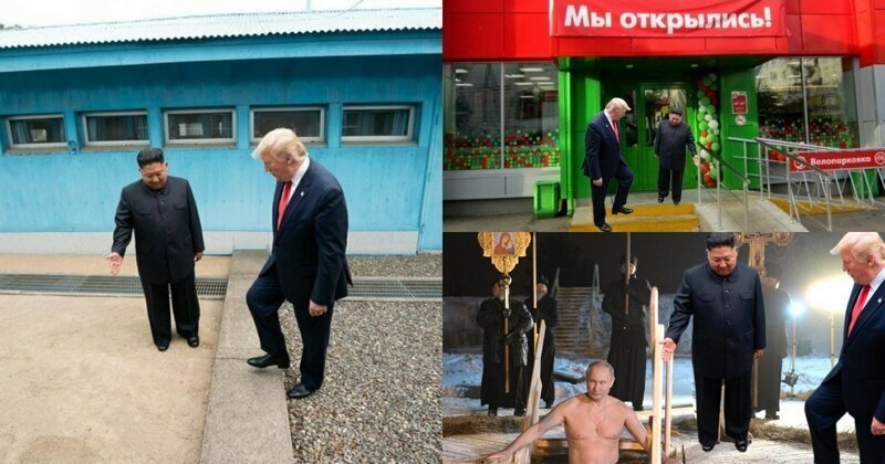 Дональд Трамп стал первым президентом США, когда-либо посещавшим КНДР. Появившееся в Сети фото, на котором Ким Чен Ын приглашает американца смелее переступить границу, мгновенно стало мемом и разошлось на фотожабы. Дональд Трамп - первый американец, который посетил Северную Корею на посту президента. Этот визит, разумеется, освещался прессой. Корреспонденты старались запечатлеть буквально каждый шаг Трампа. Без их внимания не остался и этот эпизод, когда президент США готовится шагнуть на территорию Северной Кореи, а Ким Чен Ын подбадривает его приглашающим жестом. Опубликованное фото мгновенно стало вирусным и породило множество фотожаб. Российские пользователи Сети тоже не остались в стороне и добавили к исходной картинки своего русского колорита. Получилось очень душевно