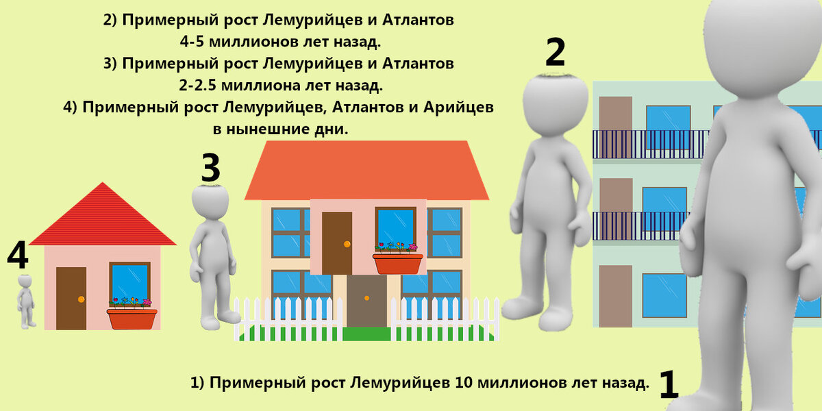 В теме №69 Азбуки сообщалось, что рост Третьей Коренной Расы (Лемурийской) вначале её появления составлял примерно 18 метров, а к моменту появления первых Атлантов уменьшился до высоты примерно в 8 метров. На протяжении многих миллионов лет рост как Атлантов, так и Лемурийцев продолжал постепенно уменьшаться. Он сократился вдвое, достигнув отметку в 4 метра, а затем ещё раз сократился вдвое до привычных нам сегодня 2 метров. Если мы посмотрим на рост сегодняшнего населения планеты, то можем обнаружить большой разброс: от 1,5 до 2-х метров и выше. В случае с Атлантами дело обстояло аналогичным образом. Имелись как представители высокого роста, так и более низкого. Разброс мог достигать от одного метра и до нескольких.