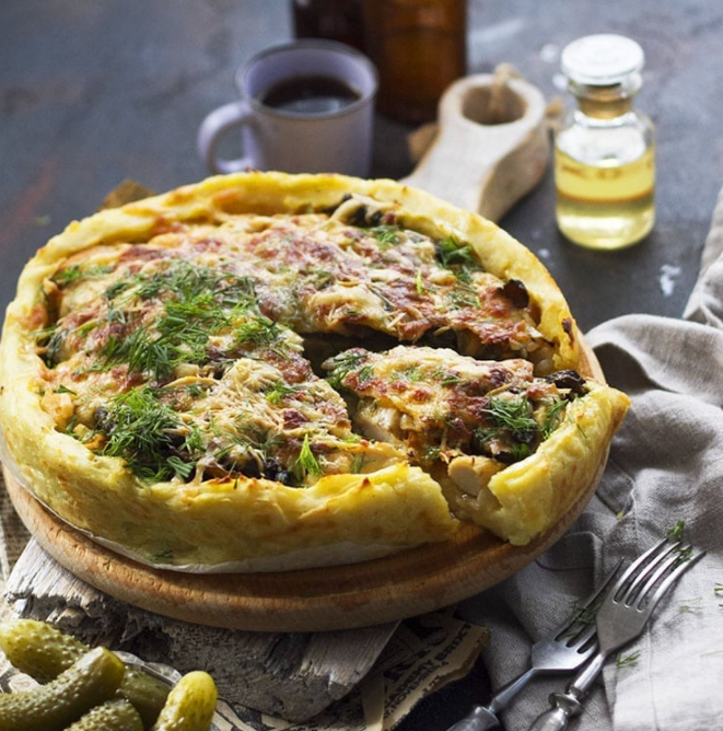 Когда у вас вдруг осталось на втрой день картофельное пюре, то можно дать ему вторую жизнь, приготовив этот простейший, но невероятно вкусный пирог. У меня так получилось, что было не только пюре, но и жаренные белые грибы, и обжаренные кусочки куриного филе, которые изначально предназначались для другого блюда. Но с другим блюдом не срослось, а вот картофельный пирог получился на славу - и красивый, и аппетитный, и просто объедение - после съеденых первых кусочков, сразу все по очереди пошли за добавкой. И в этот же день поступил заказ повторить. Второй раз уже готовила картофельный пирог целенаправленно - делала специально для него пюре, жарила курочку и грибы - лесных грибов уже не было, поэтому купила шампиньоны.