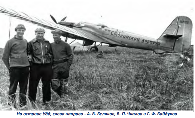 Но на Дальнем Востоке наступал уже вечер 22 июля. Становилось все темнее, а впереди, на пути к устью Амура, возвышались горы. В таких условиях было очень рискованно продолжать полет. Летчики радиограммой сообщили в Москву обстановку и получили приказание председателя комиссии по перелету Серго Орджоникидзе о его прекращении и приземлении при первой возможности. Экипаж АНТ-25 немедленно приступил к поиску места для посадки. Вскоре Чкалов высмотрел на фоне моря узкую полоску земли, оказавшуюся островом Удд (теперь это «Остров Чкалова»). Несмотря на солидные размеры самолета, Валерий Павлович, сумел его ювелирно приземлить на прибрежный участок острова, свободный от больших камней и других неровностей. Приземление, как это было отражено в бортовом журнале, произошло в 13 часов 45 минут по московскому времени. За 56 часов 20 минут от взлета до посадки было пройдено 9 374 км. Находясь на о. Удд, экипаж на борту самолета начертал надпись «Сталинский маршрут», которая красовалась на АНТ-25РД и при перелете в следующем, 1937 году, через Северный полюс. За рекордный беспосадочный перелет по маршруту Москва – Земля Франца Иосифа – Северная Земля – Петропавловск-Камчатский – остров Удд экипаж самолета АНТ-25 был удостоен званий Героев Советского Союза.