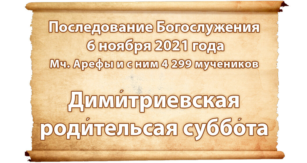 По ссылке на страницу последования богослужения можно скачать в разных форматах службу на 6 ноября 2021 года: Дими́триевская роди́тельская суббо́та; Мч. Аре́фы и с ним 4 299 му́чеников.