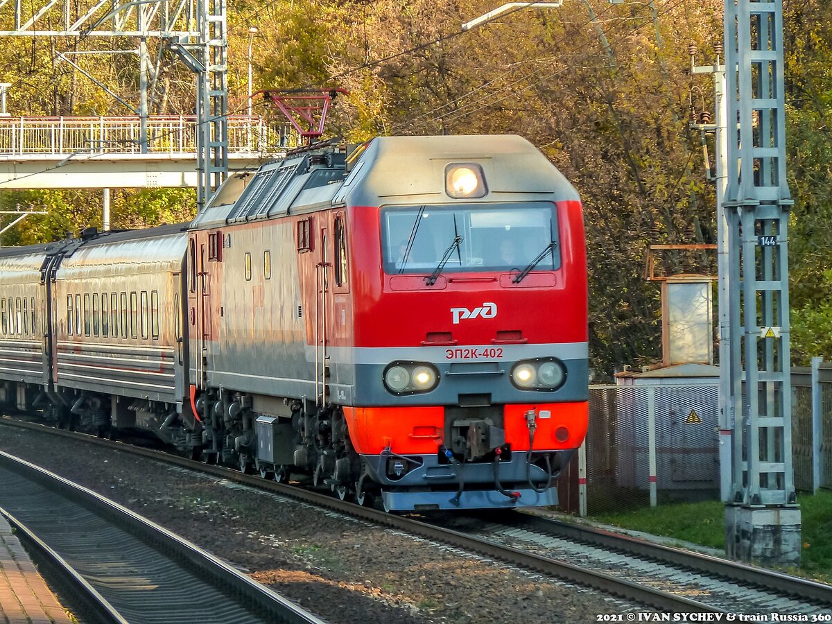 1. Утренние часы - время прибытия/отправления пассажирских поездов в Москву (или как раз из Москвы). И самые популярные серии электровозов здесь - это ЭП2К и ЧС7. Первым мимо прошел Коломенский электровоз ЭП2К-402.