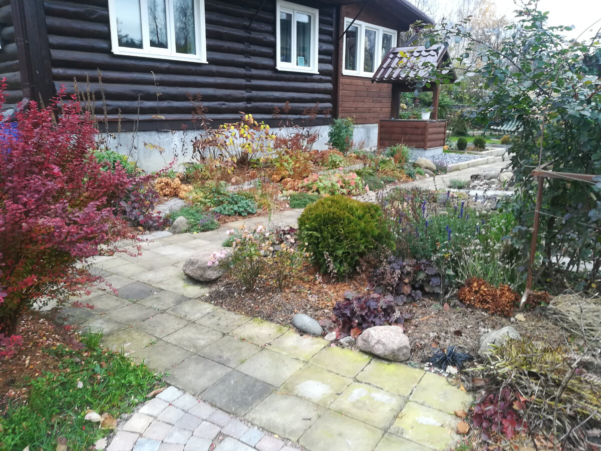 Каждый день, а чаще каждая ночь в октябре приближает нас к моменту, когда сад скажет: "Спокойной ночи!" Где-то уже выпал первый снег, где-то первые ночные заморозки отправили сады на долгий зимний сон. А нас, попугав, природа продолжает баловать солнцем и хорошей погодой. Облетают листья с деревьев и кустарников, многие лианы сбросили свои наряды. Грустно! НО! Если оглянуться вокруг, мы увидим, что многие растения все еще сопротивляются природным инстинктам и продолжают радовать нас. Сегодня я фотографировала молодые цветники, анализируя результаты отбора растений для центральной дорожки. Про цветник под окном статья опубликована 15.10. Сегодня он опять попадет в кадр просто потому, что рядом находится, и потому, что тоже новый.