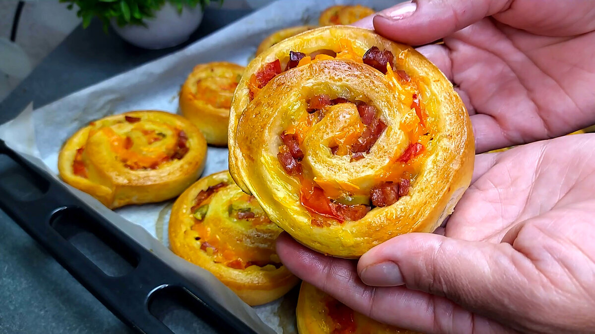 Вы любите пиццу? Мои дети её обожают. Сегодня я готовлю не простую классическую пиццу, а интересные и очень вкусные мини пиццы - это просто идеальная "ссобойка" в школу или на работу, сытный завтрак или перекус и каждый раз с новым вкусом! Ведь вариантов начинки великое множество:)) Если еще не готовили, рекомендую! Необходимые ингредиенты и видеорецепт вы можете увидеть в конце статьи ⤵️⤵️⤵️ Приготовление: теплое молоко смешиваю с растительным маслом, сахаром, солью и сухими дрожжами. Затем добавляю просеянную муку и замешиваю мягкое, не липнущее к рукам тесто, накрываю его пленкой или полотенцем и отправляю в теплое место примерно на 1 час. А пока тесто "подходит" подготавливаю начинку: нарезаю колбасу Натираю на крупной терке сыр Из помидор убираю семена и нарезаю их мелким кубиком Далее нарезаю оливки или маслины Вот так "подросло" мое тесто за 1 час. Тесто обминаю, раскатываю пласт и выкладываю начинку. Затем сворачиваю в рулет и нарезаю на кусочки толщиной примерно 2-3 см. Кажд
