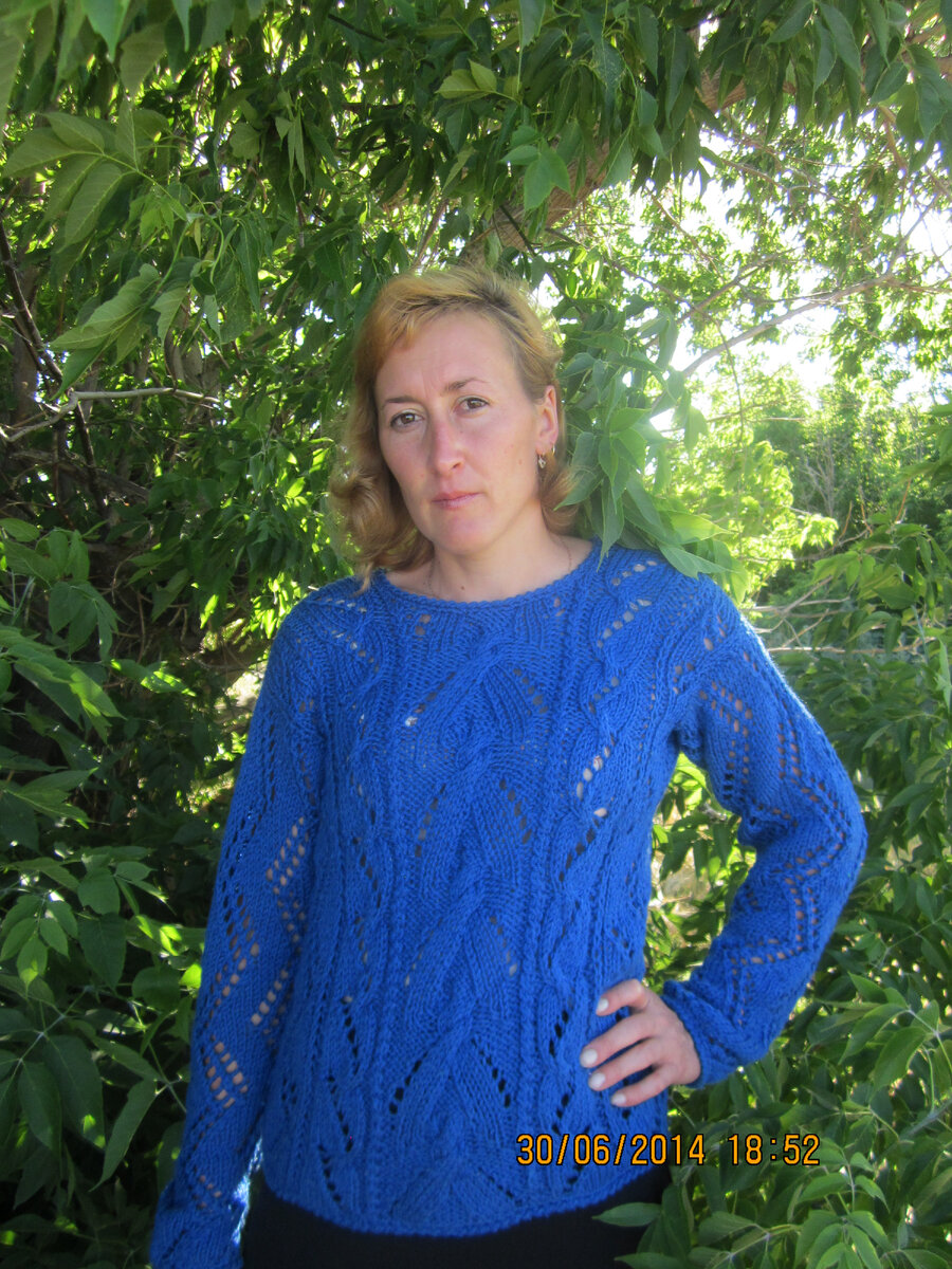 ... РАЗМЕР 48-50. ПОТРЕБУЕТСЯ 300 г пряжи,спицы № 4,крючок № 3, АЖУР "ЗИГЗАГ" -по схеме 1 в изнаночных рядах все п изн, АЖУРНАЯ ДОРОЖКА по схеме 2 в изнаночных рядах все петли вязать по рисунку. СПИНКА :Набрать на спицы 75 п и вязать ажуром "зигзаг",на высоте 40 см от начала работы для ПРОЙМ закрыть по 7 п с обеих сторон полотна(=61 п) ДЛЯ ГОРЛОВИНЫ на высоте 56 см закрыть средние 19 п,для закругления с внутренней стороны полотна закрыть 1 раз по 1 п. На высоте 60 см от начала работы закрыть оставшиеся п плеча. ПЕРЕД Набрать 76 п,вязать( распределив петли так:кром,11 п ажура "зигзаг",52 п ажурной дорожки,11 п ажура "зигзаг",кром), аналогично спинке, ДЛЯ ВЫРЕЗА ГОРЛОВИНЫ на высоте 50 см от начала работы закрыть средние 16 п,для закругления с внутренней стороны закрыть 1 раз по 2 п.На высоте спинки закрыть оставшиеся п плеча. РУКАВ: набрать 34 п и вязать ажуром "зигзаг",для скосов прибавить в каждом 8-м ряду 8 раз по 1 п(=54 п).На высоте 42 см закрыть все петли СБОРКА: сшить плече