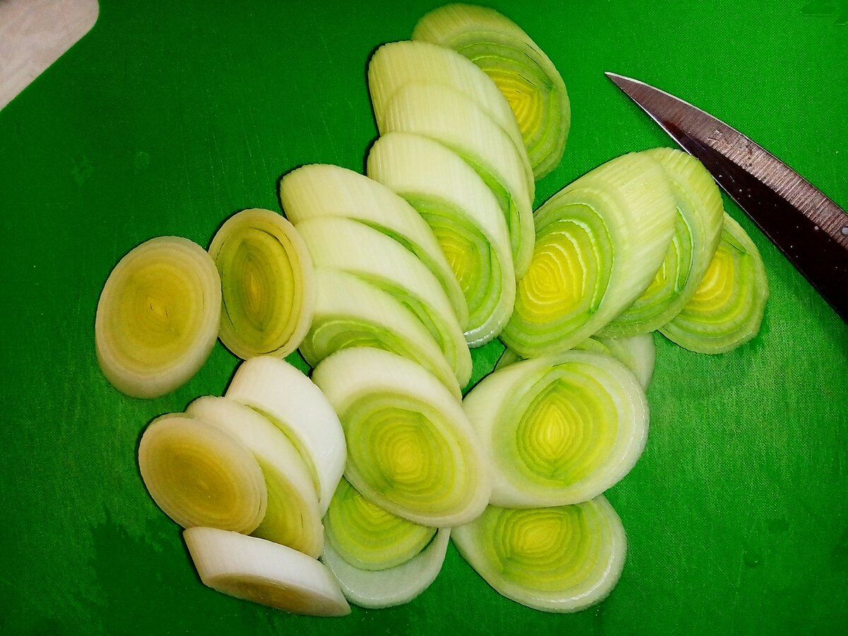 Лук-порей нарезаем по диагонали кружками (ну или, если точнее, эллипсоидами) толщиной в 0.5 см.