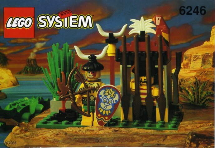 Приветствую всех на своем канале Le Gold's Hide-Out, который посвящен в первую очередь раритетам Lego System из 90х годов. В этом обзоре я вернусь к серии "Pirates" c небольшим набором из 1994 года 6246 "Crocodile Cage" в русскоязычном каталоге представленном как "Тюрьма охраняемая крокодилом" В 1994 году в серии Lego "Pirates" в дополнение к уже устоявшимся пиратам и противостоящим им солдатам красных и синих мундиров, появились наборы представившие новую фракцию островитян. Они привнесли в серию не только новую сторону, но и колорит джунглей и тропических островов, в связанных с ними наборах. В 1996 году когда я впервые увидел эти наборы на страницах каталога, они будоражили воображение. Пираты, джунгли, поиск сокровищ, загадочные каменные идолы, местные аборигены противостоящие им - это было не менее интересно и захватывающе, чем классическое противостояние на море. Но возвращаясь к набору - его коробка сохранилась в хорошем состоянии и выполнена в классических цветах серии,