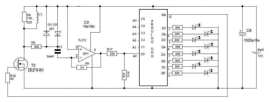 Переработанная версия всеми известного импульсного металлоискателя - "Пирата", но на Arduino. Имеет неплохую чувствительность даже на мелкие монеты. Стабилен в не зависимости от температуры и заряда батареи. Схема максимально упрощена. Из недостатков можно отметить отсутствие возможности определять тип металла. Определять тип могут только металлоискатели с радио излучающим принципом детектирования (сложны в устройстве и требуют точной настройки). Импульсный металлоискатель в свою очередь работает на магнитном детектировании индукционных токов в металле. Индукция при поиске не различима для черный и цветных металлов. К слову сказать, что есть еще третий тип металлоискателей - частотный. Малоэффективная и очень простая конструкция в основе которой генератор колебаний магнитного контура, который чувствителен к изменению величины индукции катушки. Мы ее рассматривать не будем из-за низкой чувствительности. Личный эксперименты по разработке такой конструкции в лучшем случае позволяли детект