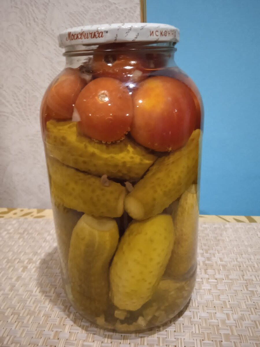 Добрый день, уважаемые читатели и подписчики моего канала! Сегодня предлагаю Вашу вниманию рецепт одной очень простой в исполнении и вкусной зимней заготовки - маринованных помидоров с огурцами. Сохраните себе этот рецепт и попробуйте в следующем сезоне! Вам обязательно понравится! Для приготовления Вам понадобится: огурцы, помидоры, укроп (1 зонтик на банку объемом 1,5 литра), вода - 1 литр, соль - 1 столовая ложка, сахарный песок - 1 столовая ложка, чеснок 2 зубчика, лист лавровый - 2 штуки (на банку объемом 1,5 литра), перец горошком черный - 4-5 штук (на банку объемом 1,5 литра), гвоздика - 1-2 штуки (на банку объёмом 1,5 литра), вода -1 литр, уксус - 1 столовая ложка. 1. Моем огурцы и помидоры, огурцы предварительно замачиваем на 3-4 часа в холодной воде. 2. Стерилизуем банки. 3. В банки укладываем укроп, лавровый лист, чеснок, перец, гвоздику, затем огурцы и помидоры. Заливаем кипятком и даем постоять 20 минут. 4. Сливаем воду в кастрюлю, измеряем объ