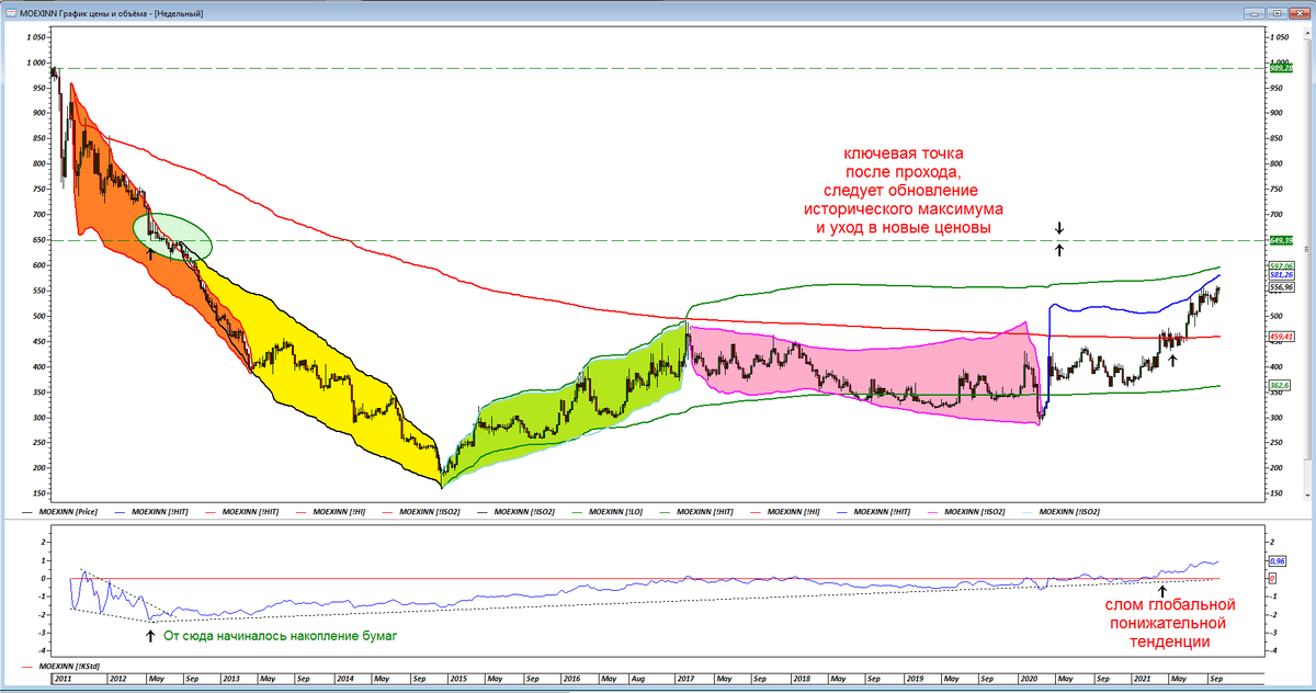 Начнем с самого индекса: снижение продолжалось с 2011 года по 2014 год, двумя фракталами. С конца 2014 года произошла смена направления, до начала 2017г (далее флетовый или боковой) трехлетний фрактал с окончанием в 2020. С прошлого года происходит повышение индекса и подход к важной переломной точке 649.39. Если индекс инноваций сможет преодолеть эту отметку, то цена направится на обновление исторического максимума 992.55. Далее при пробое максимума, умножаем индекс на два и получаем 1985. Но, сначала опустим рассказы о том, "как космические корабли бороздили просторы вселенной", и просто понаблюдаем за подходом индекса к ключевой отметке 649.39. Посмотрим, из чего он сделан.
