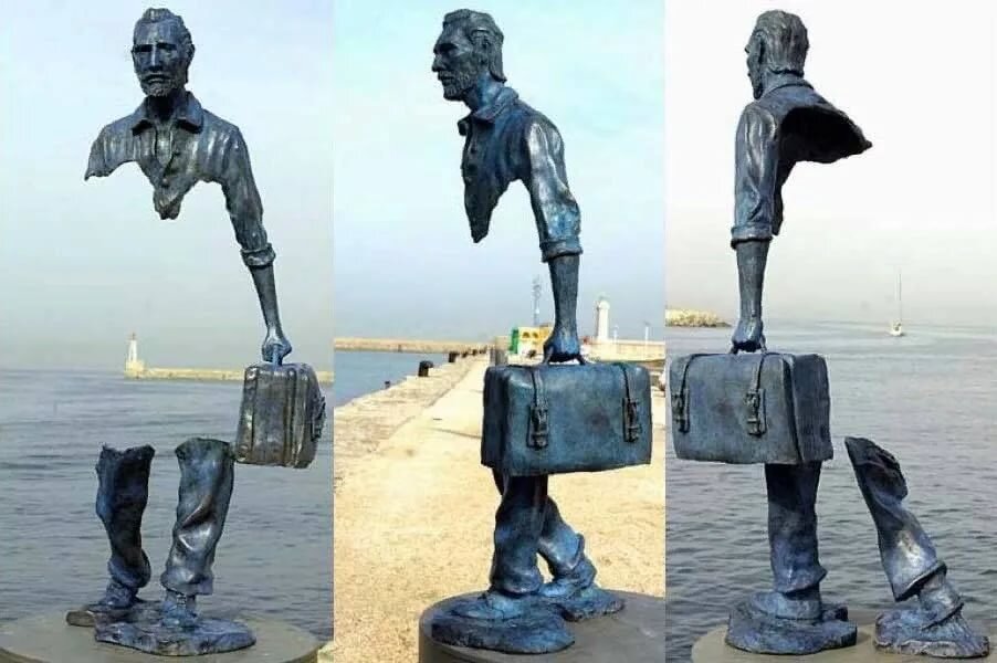 И уникально в этих фигурах то, что несмотря на отсутствие значительных фрагментов фигуры, вся конструкция сохраняла свое равновесие и устойчивость. Лица этих путешественников – это не вымышленные персонажи, а хорошо узнаваемые лица известных людей – художников, начиная с Винсента Ван Гога, с густой бородой и изможденными чертами. Все эти фигуры глубоко аллегоричны, это такие мигранты, без страны, без цели, навсегда вырванные с корнем с родных мест.