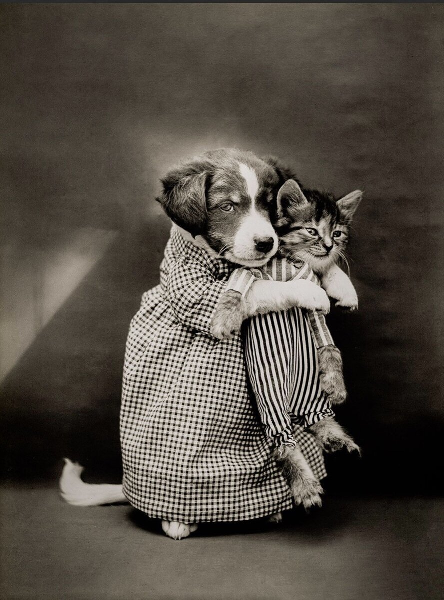 Фотограф Гарри Уиттиер Фрис (1879-1953) стал известен благодаря своим костюмированным фото щенков, котят и других животных. По словам самого Фриса он стал фотографом совершенно случайно. Однажды его семья собралась на празднование дня рождения. Кто-то из гостей пришел в смешной шляпе, и члены семьи, дурачась, начали ее примерять и фотографироваться. Под ногами вертелась кошка, на которую тоже надели шляпу. Фото кошки в шляпе и положило начало бизнесу Гарри, который начал продавать постановочные снимки производителям открыток. На рубеже веков фотооткрытки только входили в моду, и подобные творческие идеи принимались на ура. Зная, что люди не могут устоять перед щенками и котятами, Фрис начинает снимать малышей. Своих «фотомоделей» он одалживает у соседей или арендует в местном зоомагазине. Поначалу фото были относительно простыми — три котенка, сидящие в ряд, или щенок в гамаке. Со временем сценарии становятся более сложными и сюжетными, у Фриса появляется игрушечная мебель для съемок