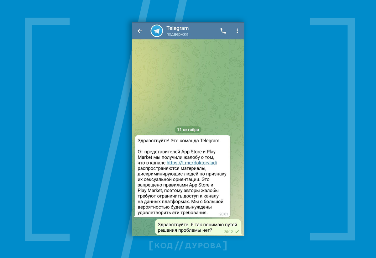 Магазины приложений App Store и Google Play потребовали от Telegram заблокировать канал основателя «Мужского государства» Владислава Позднякова. Он об этом сообщил вечером 11 октября, однако на тот момент канал всё ещё был доступен, а к его сообщению прикладывался соответствующий скриншот. В своём обращении к Позднякову команда Telegram сообщала, что будет вынуждена «с большой вероятностью удовлетворить требования» компаний, удалив доступ к каналу. Требование связано с тем, что в канале «Мужского государства» распространялись материалы, дискриминирующие людей по признаку сексуальной ориентации. Это запрещено правилами App Store и Play Market, поэтому авторы жалобы требуют ограничить доступ к каналу на данных платформах. Мы с большой вероятностью будем вынуждены удовлетворить эти требования. Источники «Медиазоны» (признана в России «иностранным агентом», ред.), близкие к Telegram, подтвердили подлинность сообщения. Позднее канал Позднякова, на котором было почти 100 000 подписчиков, и п