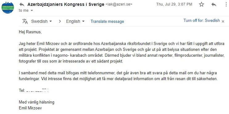 Известный шведский журналист Расмус Конбёк провел расследование в Швеции, как власти Азербайджана вербуют и оплачивают лоббистов для защиты интересов Ильхама Алиева в Европе. Дело в том, что самого Расмуса в настоящее время пытаются убедить стать азербайджанским лоббистом в Швеции. Прямо сейчас, пока вы читаете эту публикацию. Для переговоров с Расмусом и другими шведскими журналистами и политиками была создана фейковая организация "Azerbajdzjaniers kongress i Sverige" (Азербайджанский шведский конгресс). Эта организация ничем не занимается, не имеет доходов и зарегистрирована на адрес обычной съемной квартиры в Стокгольме, где проживает некто Эмиль Мирзоев. Этот Мирзоев и вступает в первичный контакт с теми, кого в Баку определили как "перспективные взяточники, с которыми можно договориться". Но с Расмусом они ошиблись. Они ему предложили встретиться и обсудить "сотрудничество", а потом закрепить дружбу поездкой в Баку за счет правительства Азербайджана. В качестве бонуса обещают позн