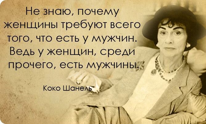 Цитаты о моде: 1. Одевайтесь так, как будто сегодня вы собираетесь встретить своего злейшего врага. 2. Мода меняется, стиль остается. 3. Мода существует не только в платьях. Мода в небе, на улице, она связана с идеями, образом жизни, происходящими событиями. 4. Элегантность не является прерогативой тех, кто только что выскочил из подросткового возраста, но тех, кто уже завладел своим будущим 4. Оденьтесь плохо, и запомнят вашу одежду, оденьтесь безупречно и запомнят женщину. 5. Всегда лучше одеться немного скромнее. 6. Простота - ключ к истинной элегантности. 7. Я не создаю моду, я - сама мода. 8. Женщина с красивыми туфлями никогда не будет уродлива. 9. Если тебе грустно, нанеси немного помады и переходи в наступление. Цитаты о любви и мужчинах: 1. Чтобы быть незаменимой, нужно все время быть разной. 2. Парадокс: чем глупее и неудачливее мужчина, тем у него больше претензий к женщине. 3. Большую любовь тоже надо уметь вынести. 4. Я пью шампанское только в двух случаях: когда я влюблен