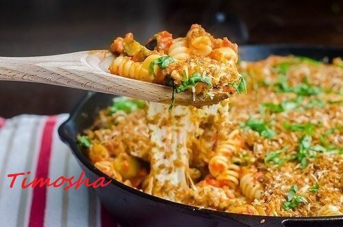 - Всыпьте оставшийся пармезан и добавьте баклажаны. По вкусу можно досолить и доперчить. Перемешайте получившуюся массу и сверху выложите моцареллу и посыпьте панировочными сухарями. Запекаем сырную пасту в духовке до расправления сыра и образования румяной корочки.