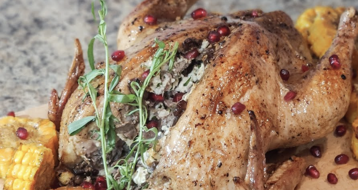 Для приготовления фаршированных цыплят по традиционному абхазскому рецепту, обычно используют вертел, установленный над огнём. Но его вполне можно заменить шампурами. От этого вкус блюда ничуть не пострадает – покрытый аппетитной корочкой, фаршированный смесью сыра и фруктов, цыплёнок непременно приведёт в восхищение ваших гостей. Для приготовления этого блюда нам потребуются: - цыплята – 2 шт., - сливочное масло – 20г, - сыр сулугуни – 200г, - гранат – 1 шт., - изюм и курага – по 120г, - сухие пряности, перец, соль – по вкусу. Приготовление Начинаем процесс с подготовки сухофруктов. Тщательно промываем изюм и курагу, даём обсохнуть, и освобождаем от косточек, если они имеются. Затем заливаем их кипятком, накрываем крышкой и оставляем напариваться на 15 минут. В это время потрошим цыплят, моем их изнутри и снаружи, обсушиваем бумажным полотенцем. Для данного блюда лучше выбирать не слишком большие тушки – массой не более 1 кг. Когда сухофрукты запарились и приобрели мягкость, измельча