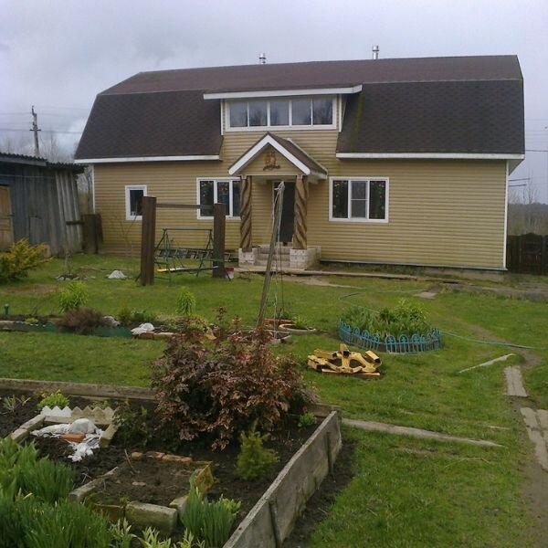 Небольшой такой домик, размером 10 на 15 метров, обшитый сайдингом, с ломаной крышей, покрытой гибкой черепицей коричневого цвета.