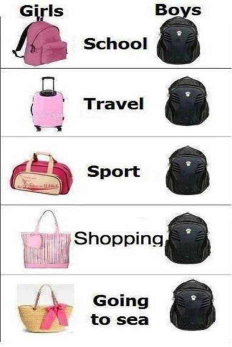 Howdy! Я снова здесь с нашей рубрикой, в которой мы разбираем мемы на английском языке. Предыдущий разбор читаем здесь. Сегодня, как всегда, займемся новой порцией англоязычного юмора. Багаж знаний В данном меме в очередной раз поднимается тема того, как по-разному представители обоих полов подходят к различным вопросам. Тут говорится о том, что у девочек есть множество видов различных сумок, в то время как парни используют везде один и тот же рюкзак. Признавайтесь: узнали в этом меме себя? Здесь у нас две колонки: «Девочки» («Girls») и «Мальчики» («Boys»). Далее по центру различные места и ситуации, в которых может пригодиться какая-нибудь сумка, переведем их: school (школа), travel (путешествие), sprot (спорт), shopping (поход по магазинам), going to sea (поход на море). Как видите, спорт и шоппинг – уже знакомые нам слова, которые перекочевали в русский язык в оригинале. Если узнали для себя новые слова – запоминаем. Сон превыше всего А в герое следующего мема почти наверняка больши