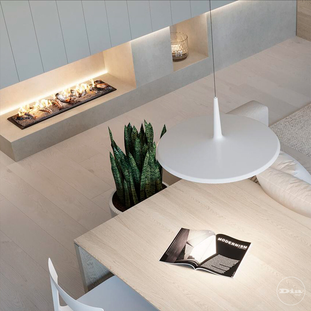 Монохромная гостиная с камином Светлое помещение в бежевых тонах с яркими элементами в виде живых растений и открытого огня