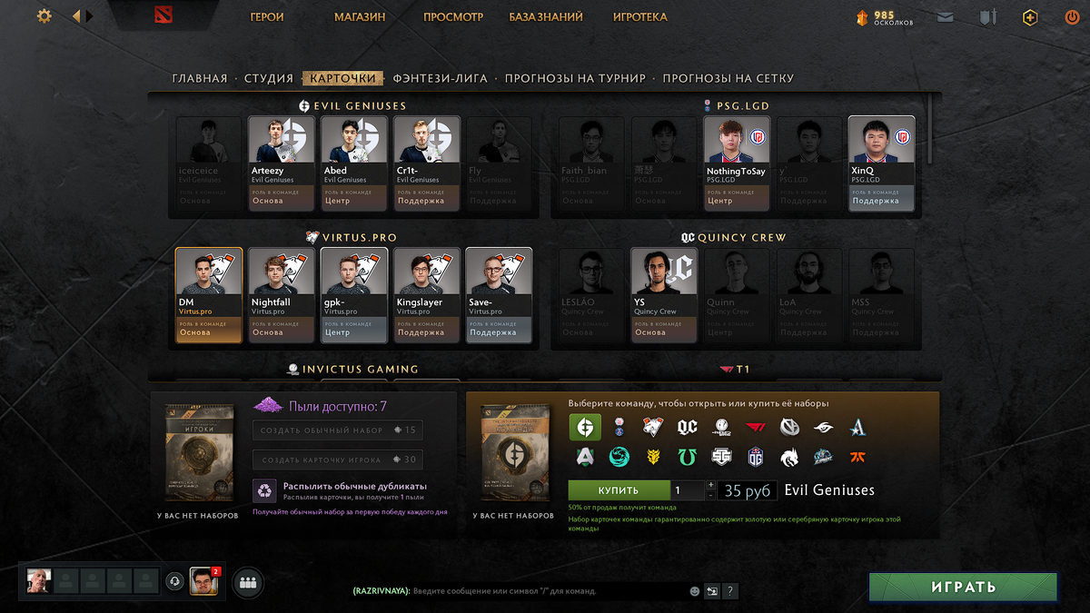 Я наблюдал за турниром с его первого дня и это действительно было интересно, а иногда даже завораживало, раньше я не смотрел инт вообще. Я получил далеко не все карточки, почти не играл и закидывать деньги не хотелось, но получил неплохое количество фэнтези очков. Прогнозы на турнир не удались, ведь я не сильно следил за метой и большую часть выставил наугад и в итоге получилось 5 совпадений, а это уже неплохо. Прогнозы на сетку я сам не составлял, а взял с рандомного видео на ютубе, в них получилось 10 совпадений, а это 5000 очков компендиума и это радует. По итогу турнира я могу сказать что очень рад за Team Spirit и считаю что победа заслуженна, а так же они доказали что не нужны какие-либо медийные личности и старые проф.игроки для победы на TI. Важной частой является их сила воли и духа, ведь в последний день они сыграли 8 матчей и обыграли две очень сильные команды. Во время игр с PSG.LGD их нервы не сдавали и они продолжали стабильно играть, не считая 3 и 4 карты. Team Spirit -