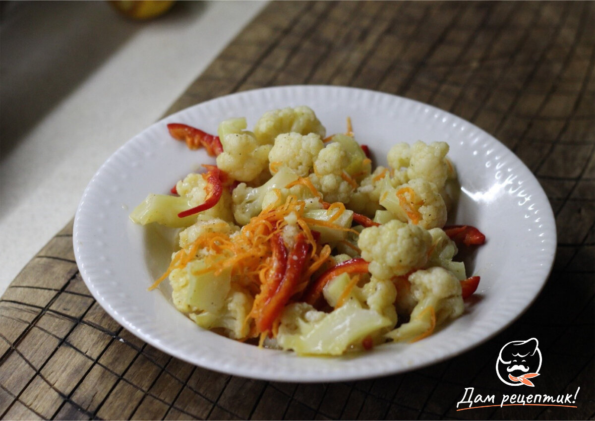 Капуста в пикантном маринаде – это очень яркая и вкусная закуска в корейском стиле. Простой рецепт этой закуски из капусты точно понравится всем любителям острых блюд! Если залить капусту горячим маринадом, ее можно закрыть и на зиму. Хранить заготовку нужно в холодильнике. Энергетическая ценность на порцию Сложность рецепта: Ингредиенты: Из расчета на 800 грамм Рецепт приготовления: Шаг 1 Для начал нужно бланшировать капусту. Нужно отварить кусочки капусты после закипания в течение двух минут. Шаг 2 Добавить к капусте натертую морковь. Шаг 3 Всыпать рубленый перец. Шаг 4 Довести маринад из оставшихся компонентов до кипения. Влить маринад к овощам. Отправить заготовку в холодильник или закатать в банки. Шаг 5 Ароматная цветная капуста в маринаде готова! Такие рецепты на зиму всегда получаются быстро и готовятся очень просто. Приятного аппетита! *********************************************************** Подписывайтесь на наш канал! С нами готовить просто и быстро! Мы пошагово расскажем