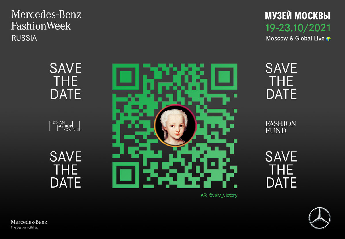 В новом сезоне традиционный символ Недели моды, инфанта, вдохновлена темой «зеленый digital» и выполнена в AR (дополненной реальности). AR доступен по QR-коду: каждый желающий может перейти по нему и сделать фото с инфантой в дополненной реальности. В ее платье удалось совместить экологичный материал мицелий и 3D-печать. AR-версию инфанты разработала Виктория Волокитина – медиахудожник, создающий работы в дополненной и виртуальной реальностях. Художник работает с генеративной графикой, игровой средой, AR/VR, датчиками движения. Виктория – участник международных фестивалей света, выставок digital-born-арта.