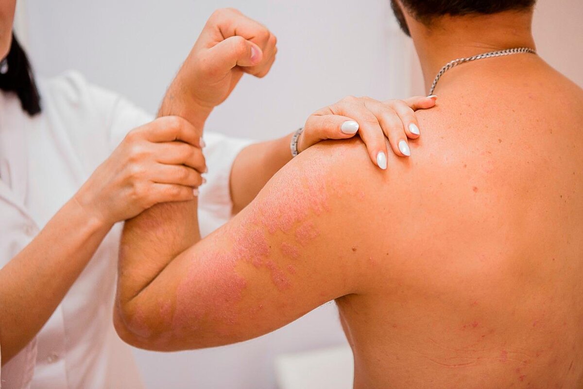 Обычно псориаз проявляется образованием красных, сухих, приподнятых над поверхностью кожи пятен — так называемых папул, которые сливаются между собой, образуя бляшки.