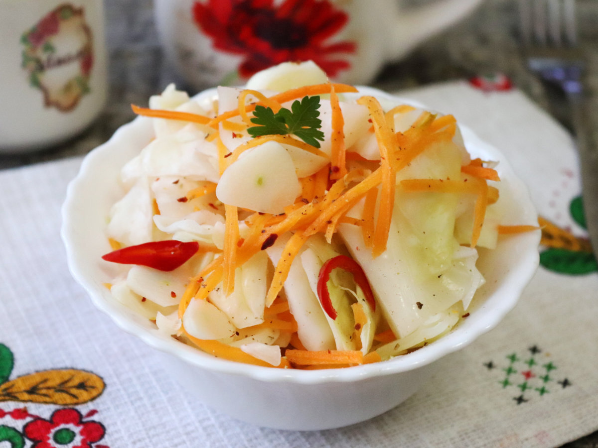 Рецепт очень вкусной острой капусты, которая готовится без особых хлопот. Надо лишь нарезать овощи, залить рассолом и подождать 3 дня. Ккал: 30.65, время приготовления: #Салаты и закуски #Тёрка #Русская #Блюдо ПП #Гарнир #Закуска #Постное блюдо #Просто приготовить Основное Рассол Приготовление: 1. Подготовить ингредиенты для острого салата из капусты. Овощи помыть и почистить. Из перца при желании удалить семена, если думаете, что будет слишком остро. 2. Чеснок нарезать тонкими пластинами, перец чили колечками.