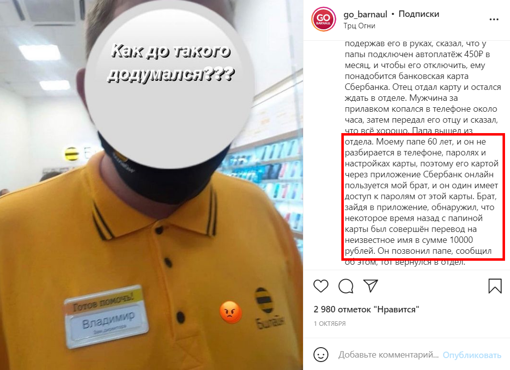 С пенсионера списывалась слишком большая абонентская плата. Мужчина с бэйджиком взял телефон, сказал, что у него подключен автоплатёж 450₽ в месяц, и чтобы его отключить, ему понадобится банковская карта Сбербанка. Вскоре выяснилось, что карты пенсионера был совершён перевод на неизвестное имя в сумме 10000 рублей. По материалам Инстаграм канала @go_barnaul