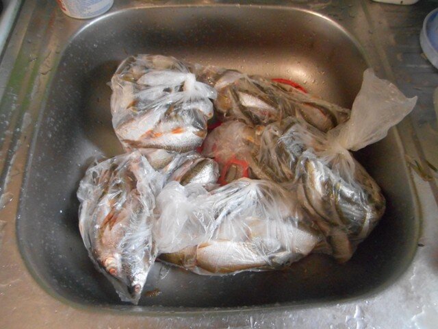 Вот и осень пришла. А значит, пришло время подводить итоги. Итоги летней рыбалки. Для этого залезем в морозильник и посмотрим, что же нам удалось наловить за сезон летней рыбалки. Что мы еще не съели и не переработали. Я предпочитаю летнюю рыбалку, и не увлекаюсь зимней. Почему? Да потому, что зимой световой день очень короткий. И весь этот день я нахожусь на работе. А в выходные дни нужно сделать много домашней работы, повкусней приготовить и что-нибудь испечь. А еще отдохнуть перед рабочей неделей. Поэтому времени на зимнюю рыбалку не остается. А пока займемся ревизией морозилки. Что же мы такого наловили за лето – осень. 1. Ух, сколько мелких рыбешек наловили. Что бы такого вкусного из них приготовить? А давайте сделаем рыбные котлеты! Это очень вкусно. Достаем из морозилки запасы мелкой речной рыбы. Размораживаем. 2. Отрезаем головы и плавники. Это удобно делать кухонными ножницами. Получаются маленькие тушки. 3. Так поступаем со всей имеющейся рыбой. 4. Подготовленную рыбу пропуск
