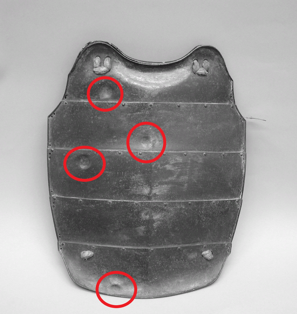 О том, что качественный европейский доспех мог выдержать прямое попадание пули (пистолета или аркебузы), сейчас знают многие. А вот мог ли тем похвастаться японский доспех? Причем не намбан-до, купленный у европейцев, а самый что ни на есть канонический японский? Оказывается, мог. Вашему вниманию предъявляется нагрудник от кирасы типа окэгава-до, подтип - омодакэ-до (с выраженным центральным ребром жесткости). Отметины от пуль я выделил специально. На самом деле, как сообщается на сайте Метрополитен-музея, где этот нагрудник хранится, их даже не четыре, а семь. Но прочие три на фото плохо видны - оно черно-белое, с не совсем удачным ракурсом, а вмятины небольшие. Размеры: высота 39,4 см, ширина 32,1 см.