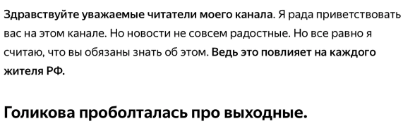 "Мы вас сделали по полной программе!" - Голикова растрепалась о том, что будет с граждананми после выходных
