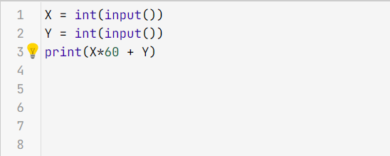 Напишите программу: Тимофей обычно спит ночью XX часов и устраивает себе днем тихий час на YY минут. Определите, сколько всего минут Тимофей спит в сутки. Внимание, программа принимает значения XX и YY из стандартного потока ввода (функция input), результат надо выводить в стандартный поток вывода (функция print). Обратите внимание на то, что приглашение, переданное в качестве аргумента в функцию input, считается выводом вашей программы. Используйте эту функцию без аргументов: values = input() # без строки приглашения! Для этой задачи введён корректный шаблон, так что решать ничего не нужно, разберитесь с тем, что происходит в решении и как нужно оформлять код для сдачи его в систему. Также обратите внимание, что в этой задаче (и во всех последующих задачах, где вам надо будет написать программу), предлагается пример входных (Sample Input) и выходных данных (Sample Output). Вы можете использовать эти данные для того, чтобы проверить, что ваша программа работает правильно (по крайней м
