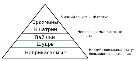 С древних времен в индийском обществе существует особая социальная система. Их общество разделено на касты, то есть на некие слои.Каждый слой занимает свое социальное положение в обществе. вот схема индийских каст в виде пирамиды: На самом верху находится каста брахманов. Туда входят священнослужители и гуру. Сразу под ними кшатрии - это каста воинов и правителей. Под ними находятся вайшьи - это торговцы, земледельцы и скотоводы, а под ними шудры - это простые рабочие, уборщики и слуги. В самом же низу пирамиды находятся неприкасаемые, которые вообще не являются кастой. Они как бы вне этой кастовой системы, но при этом отношение со стороны всех других каст к неприкасаемым как к самым низшим из людей. Считается, что неприкасаемый способен осквернить собой членов других более высоких каст. Неприкасаемые традиционно занимались в Индии самой грязной, тяжелой и унизительной работой. Они ловили крыс, чистили выгребные ямы, занимались сожжением трупов, забивали скот и так далее. В индуизме е