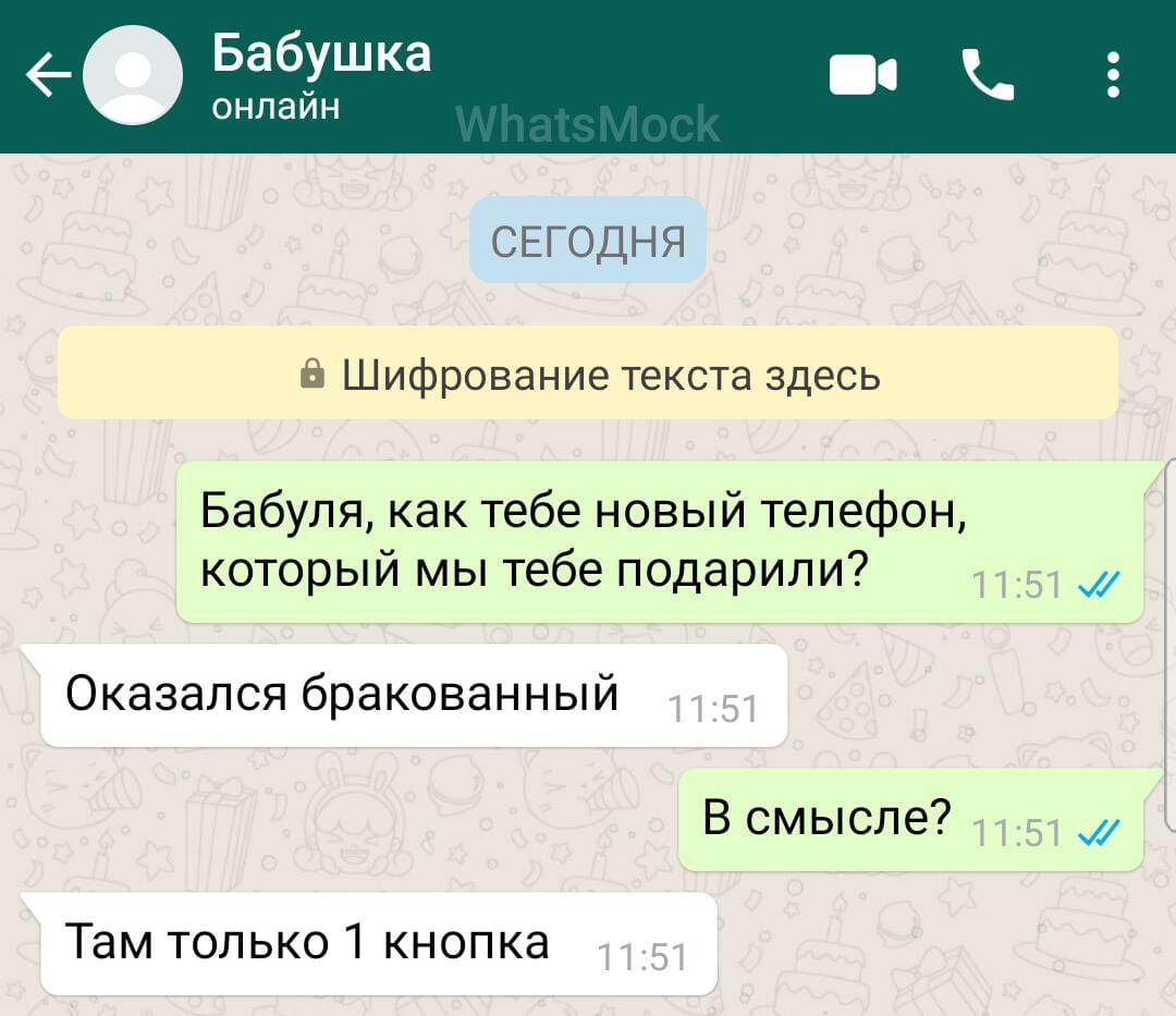 Привет, дорогой друг! Снова понедельник на календаре, а это значит, что твоя рабочая неделя снова начнётся с хорошего настроения, потому что я снова постарался и кое-что для тебя придумал. Под кое-что я имею в виду новую порцию смешных переписок. Как-то на своем канале я придумал для вас смешные #сообщения , в которых главными героями стали бабушки и их #внуки (ссылку на статью я прикреплю в конце) и её очень тепло приняли. Поэтому выбор темы для новых сообщений не стал для меня сложностью. Встречайте, 8 смешных переписок с бабушкой, в которых присутствуют милые трудности при использовании мобильного телефона. Подбирая бабушке мобильный телефон, прежде всего нужно быть практичным. Величина шрифта должна зависеть от её зрения. А количество кнопок напрямую связано с годом ее рождения — чем моложе бабушка, тем меньше кнопок может быть на телефоне. Однако, если год рождения бабули совпал с годом рождения Стива Джобса — это не гарантия того, что она разберётся, как пользоваться айфоном. Во