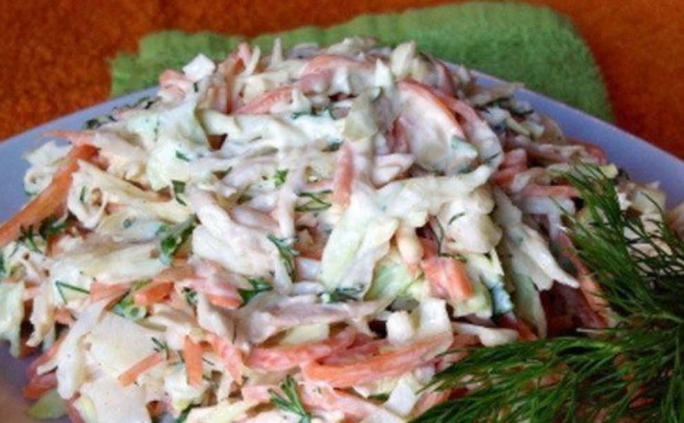 Легкий и вкусный салат :) ИНГРЕДИЕНТЫ: · Куриное филе - 2 шт; · Капуста свежая - 300 г; · Морковь - 200 г; · Укроп - 1/2 пуч.; · Петрушка - 1/2 пуч.; · Майонез - 3 ст.л.; · Соль, перец ; ПРИГОТОВЛЕНИЕ: Куриное филе отварить, остудить, разобрать на волокна. Свежую капусту тонко нашинковать, слегка помять. Зелень промыть, обсушить, измельчить. Соединить все ингредиенты, добавить морковь по-корейски, соль, перец по вкусу, заправить майонезом, выложить в салатник.