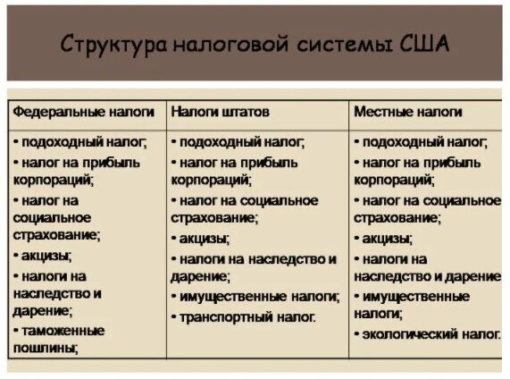 Аналог нашего НДФЛ в США - это Federal Incom Tax (от 10 до 39.6%, в зависимости от получаемого дохода), но это не единственный налог с зарплаты.... Кроме федерального подоходного налога, есть ещё налог штата. Он может вообще отсутствовать (Техас), быть плоским (3% в Калифорнии), или прогрессивным(от 1% до 15%). И кроме того, бывает ещё налог графства или города. Помимо этого, все работающие платят социальные налоги - Social Security Tax 10,8% и Medicare Tax 4,6% (50/50 работник и работодатель), эти налоги плоские и налоговые вычеты на них не распространяются. При расчете Income tax, кроме прогрессивной системы скобок, применяется налоговый вычет. На одинокого работающего он составляет 12200$ в год если применяется стандартный вычет, или можно применять детализированный вычет, и тогда из налогооблагаемой суммы можно вычесть ипотеку, лизинг автомобиля, медицинские расходы, пенсионные накопления, расходы на обучение и т.д. и эта сумма налогом облагаться не будет. НДС в штатах не