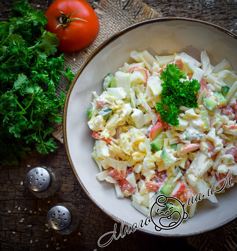 «Только не творог!» – знакомая многим мамам фраза. Я лично очень люблю творог в любом виде, а вот мои дети относятся к нему по-разному. Но совсем недавно я узнала рецепт легкого диетического салата из, казалось бы, не сочетаемых друг с другом продуктов, который понравился всем членам семьи. В основе салата два вида творога и овощи, и значит, получается не только вкусное, но и полезное блюдо. На приготовление уходит минимум времени, что для меня тоже очень важно. Необходимые ингредиенты: Пекинскую капусту нарезаю небольшими полосками и кладу в глубокую миску. Вместо капусты можно использовать листья салата или любой салатный микс. Но с капустой блюдо все же получается вкуснее. Сваренные и охлажденные яйца очищаю, измельчаю и отправляю к капусте. Томаты и огурцы мою и просушиваю бумажным полотенцем. Огурцы режу кубиками, а помидоры — небольшими дольками. Все это отправляю в салатник. Далее нарезаю в салат крабовые палочки или мясо. Если вы берете замороженные палочки, то сначала их след